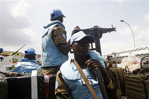 UN troops provide security at the Golf Hotel in the city of Abidjan, Ivory Coast, Friday, Dec. 10, 2010. The United States warned Laurent Gbagbo that he faces punitive sanctions if he continues to refuse to step down following a disputed presidential election that the United Nations says were won by his opponent.(AP Photo/Schalk van Zuydam)